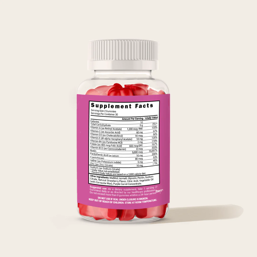 Nuestras gomas están formuladas con ingredientes puros y de alta calidad, garantizando una absorción óptima y un resultado visible en poco tiempo. Contienen una combinación de biotina, vitamina B12, vitamina A, vitamina C, vitamina D y zinc, que trabajan en sinergia para promover un saludable crecimiento del cabello, la renovación de la piel y el fortalecimiento de las uñas.