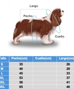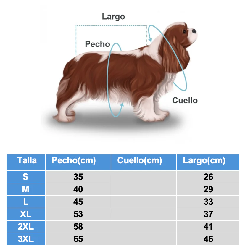 No olvides medir a tu mascota y consultar nuestra tabla de tallas para encontrar el ajuste perfecto. Recuerda, la circunferencia del pecho es la medida más importante. Para mascotas con mucho pelaje, te recomendamos elegir una talla más grande para asegurar un ajuste cómodo.