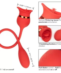 ¡Hola, amante del placer! ¿Lista para una experiencia inolvidable? Te presentamos el Beso Francés Casanova, un vibrador de doble estimulación diseñado por Calexotics, que te llevará a nuevas alturas de éxtasis. Este juguete sexual de color rojo pasión, fabricado con silicona ultra suave de grado médico, te ofrece una estimulación incomparable.